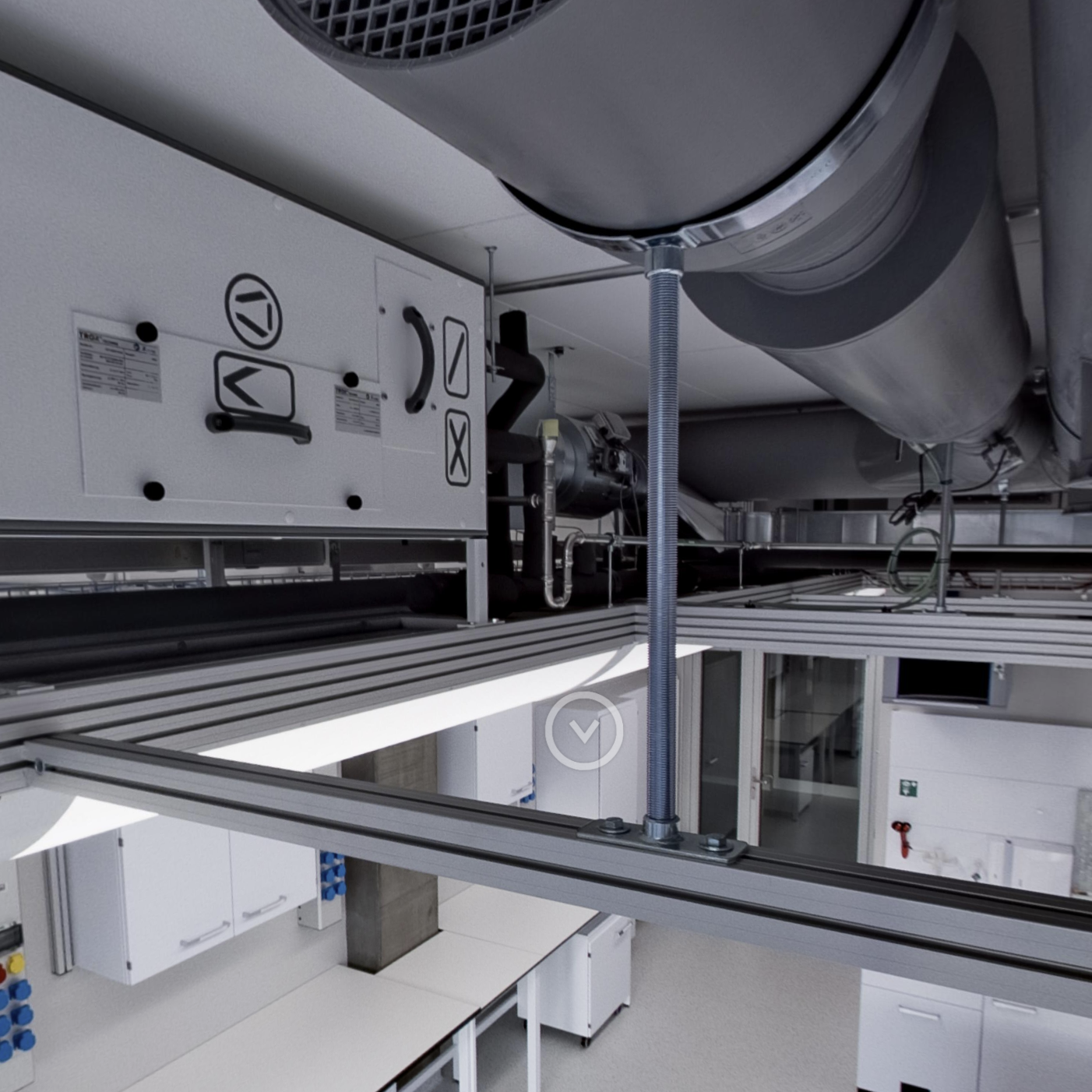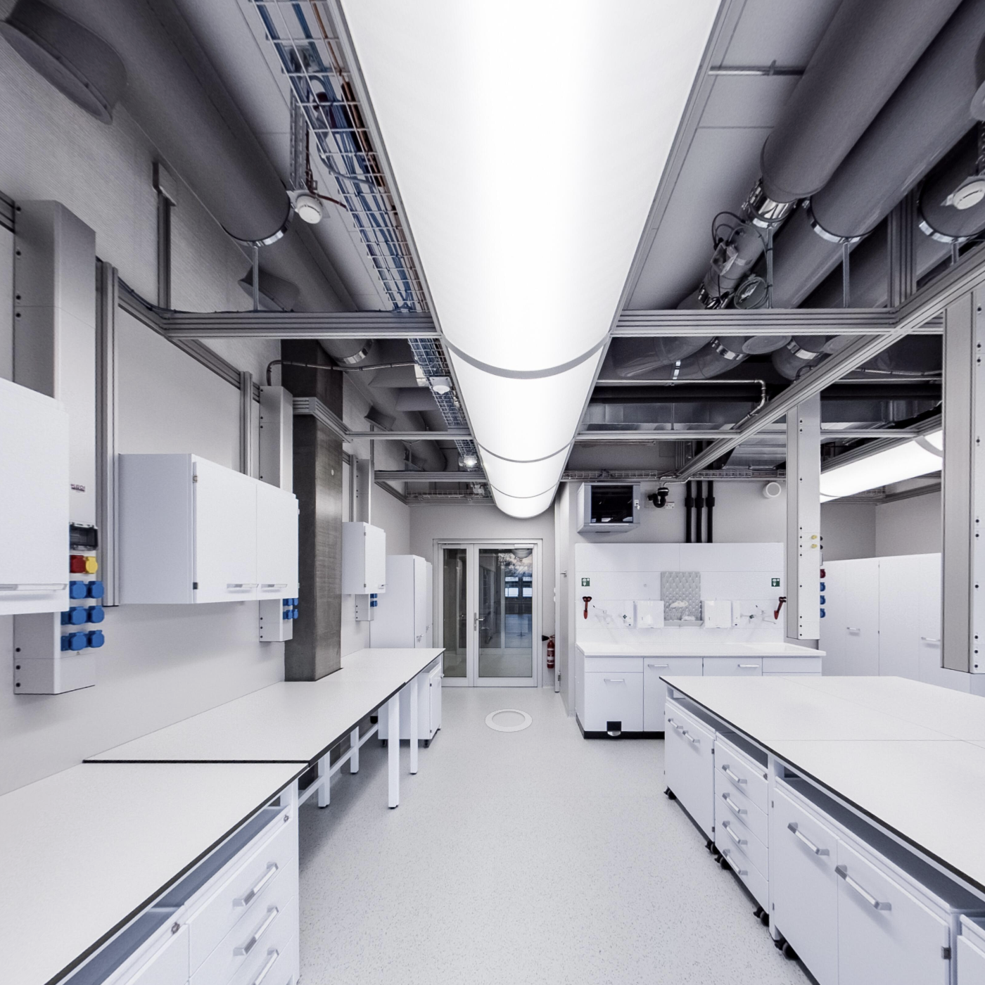 Integration hochtechnisierter Laborausstattung inklusive HLKS / Gase / Laborkühlwasser und Mediendecke in standardisierten Laborachsen mit vollautomatischer Luftmengenregulierung mit integrierten Messeinrichtungen zum flexiblen Anschluss von Prozessabluft. Umsetzung für maximale Flexibilität für zukünftige Umnutzungen / Laborunterteilungen sowie Integration von Absaugstellen / Mediensäulen etc.
